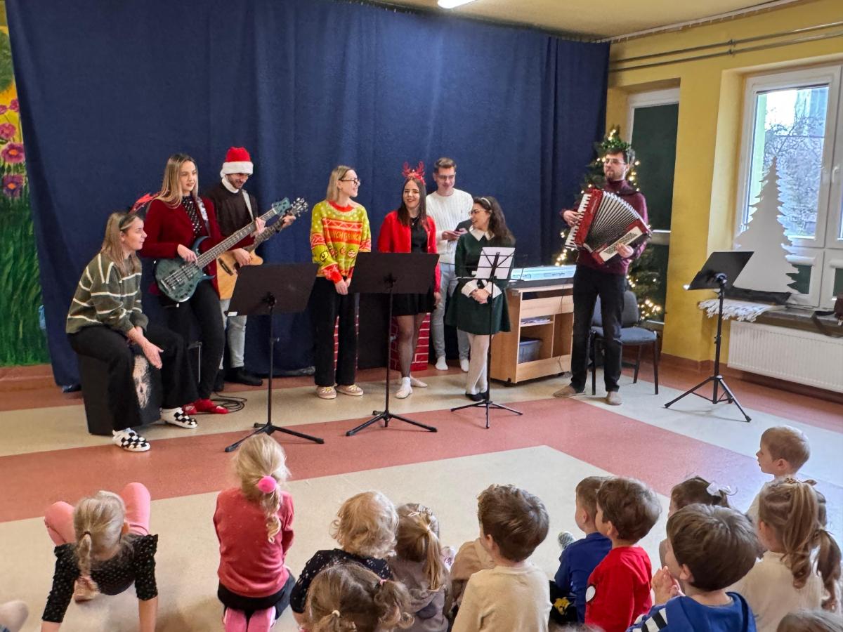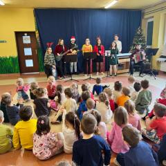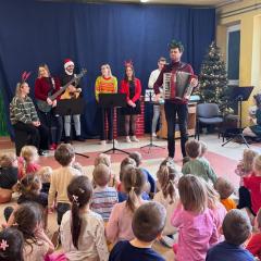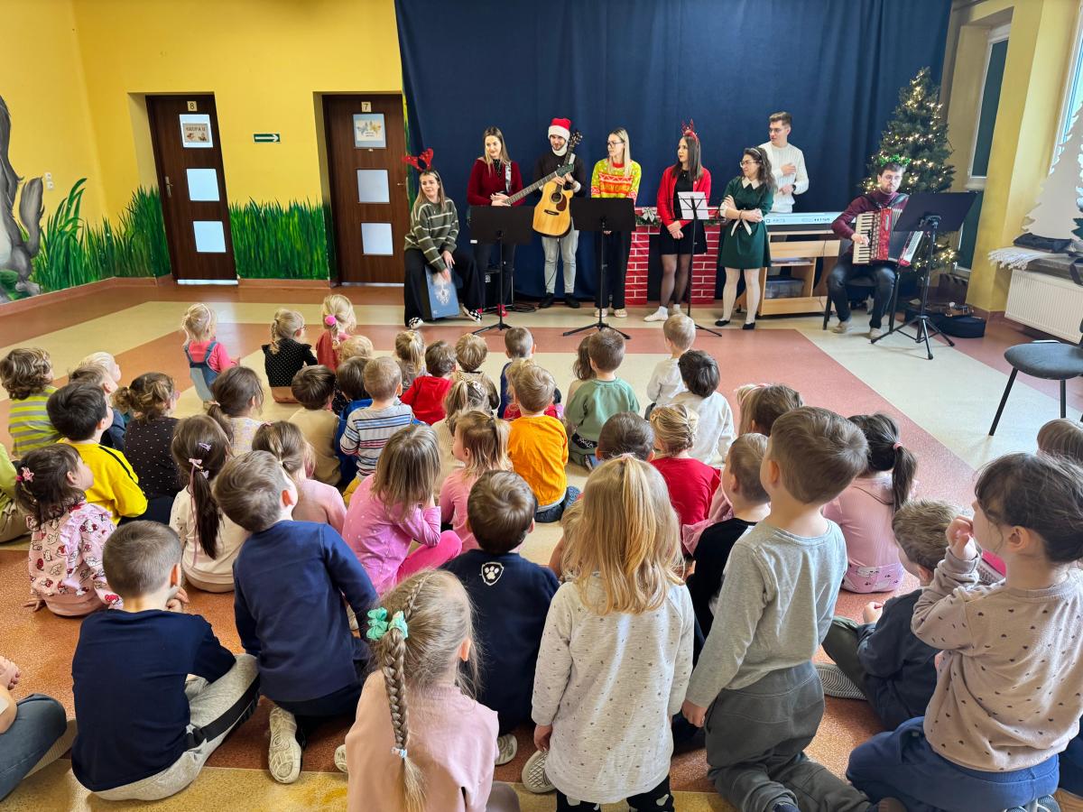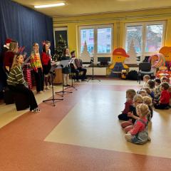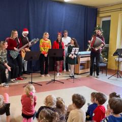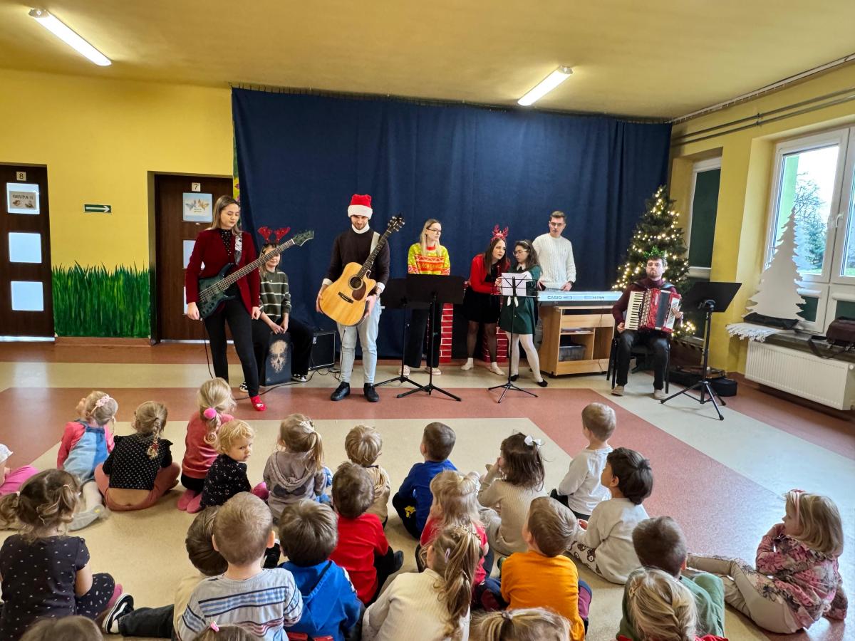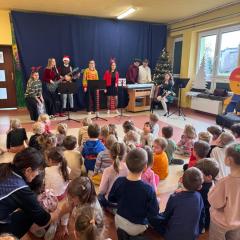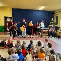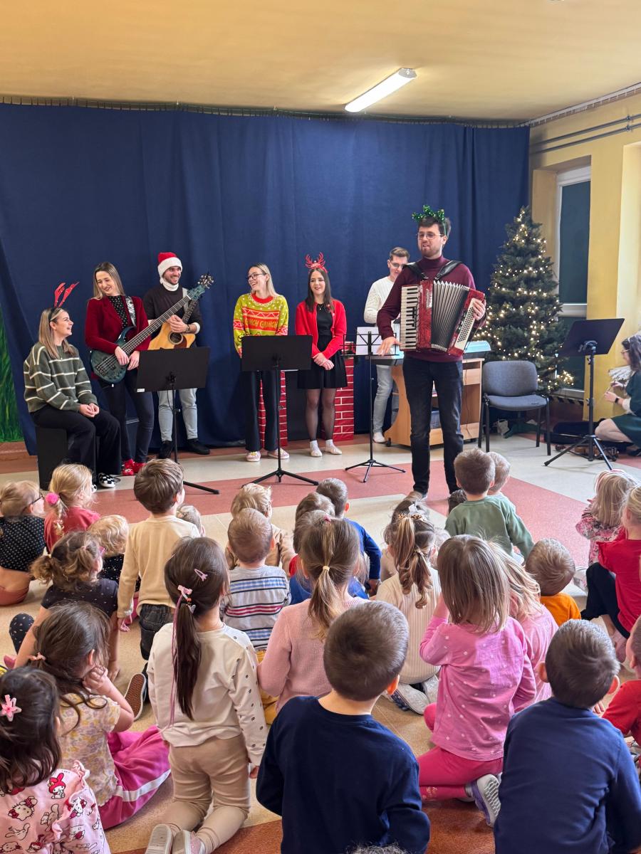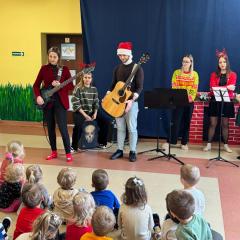 Dnia 3 grudnia w naszym przedszkolu odbył się występ praktykantów ze szkoły muzycznej. Zaśpiewali dla dzieci kilka kolęd, a następnie zaprezentowali różne instrumenty muzyczne. Opowiadali i pokazywali, jakie dźwięki wydają poszczególne instrumenty — czy są ciche, czy głośne, wysokie lub niskie. Dzieci z zainteresowaniem oglądały występ i aktywnie uczestniczyły w zajęciach muzycznych.