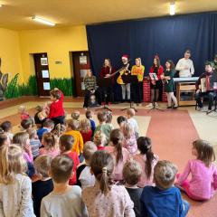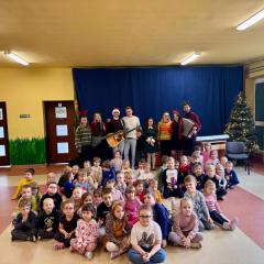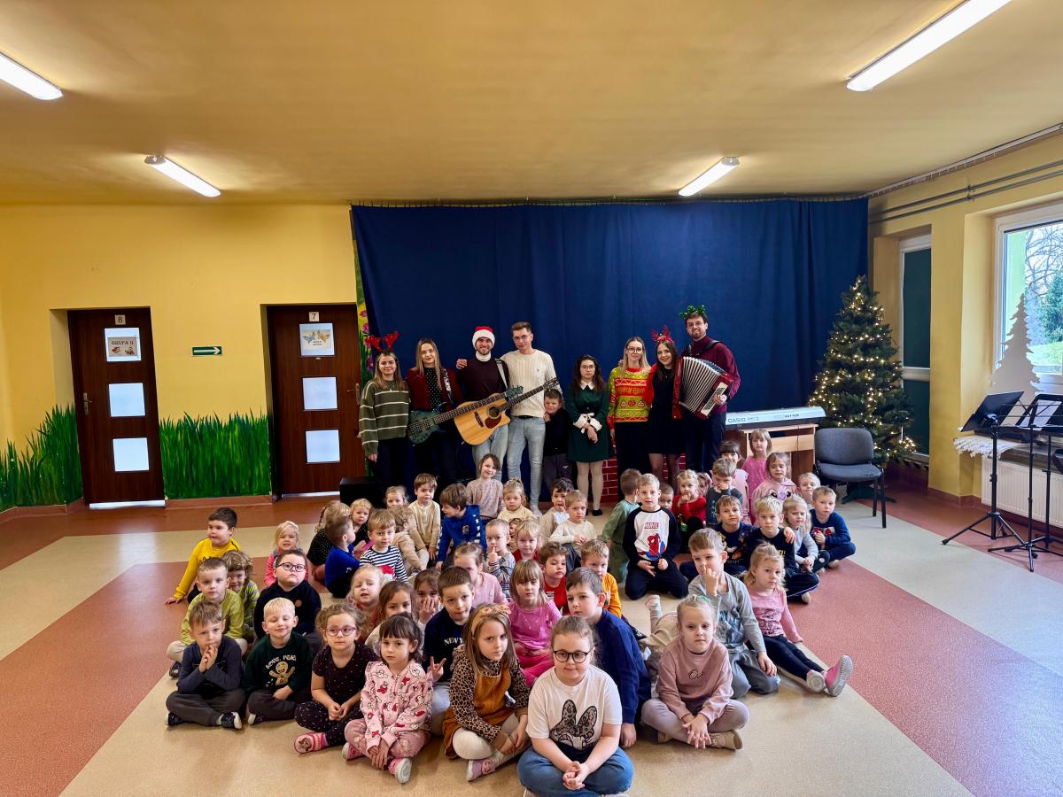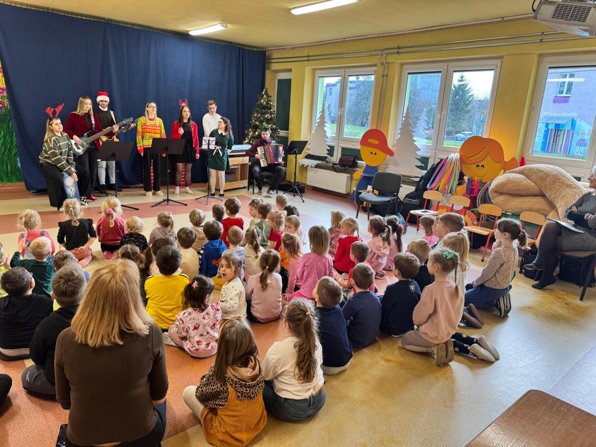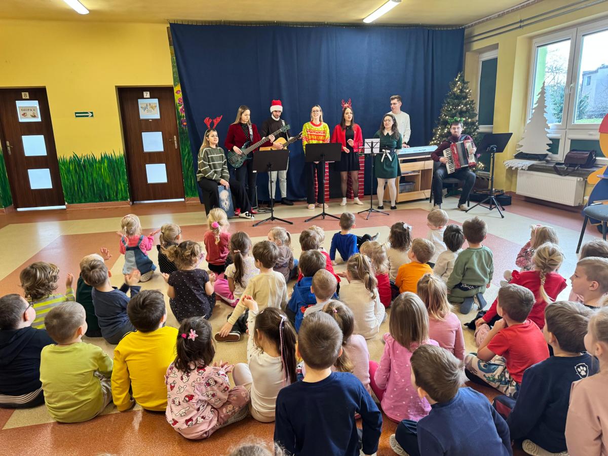Dnia 3 grudnia w naszym przedszkolu odbył się występ praktykantów ze szkoły muzycznej. Zaśpiewali dla dzieci kilka kolęd, a następnie zaprezentowali różne instrumenty muzyczne. Opowiadali i pokazywali, jakie dźwięki wydają poszczególne instrumenty — czy są ciche, czy głośne, wysokie lub niskie. Dzieci z zainteresowaniem oglądały występ i aktywnie uczestniczyły w zajęciach muzycznych.