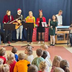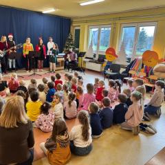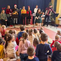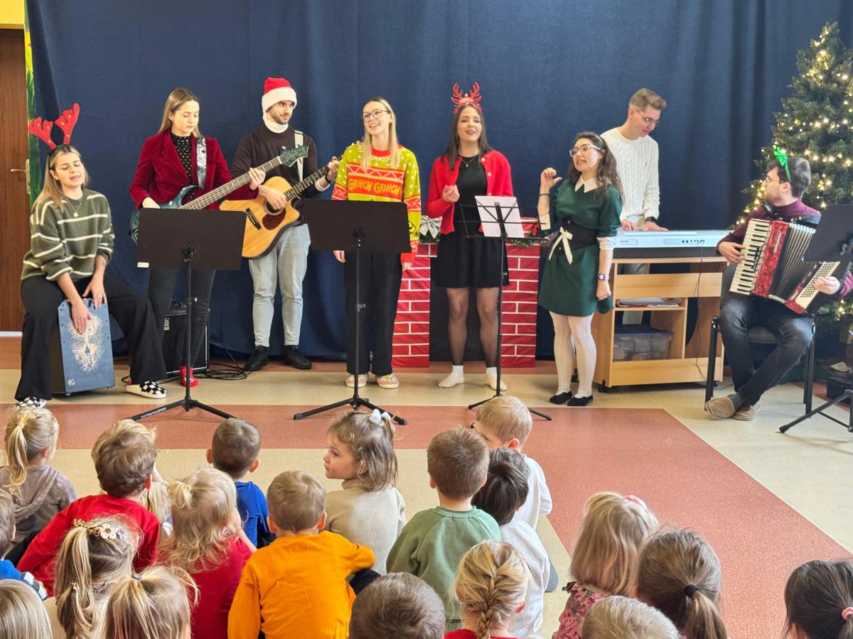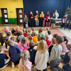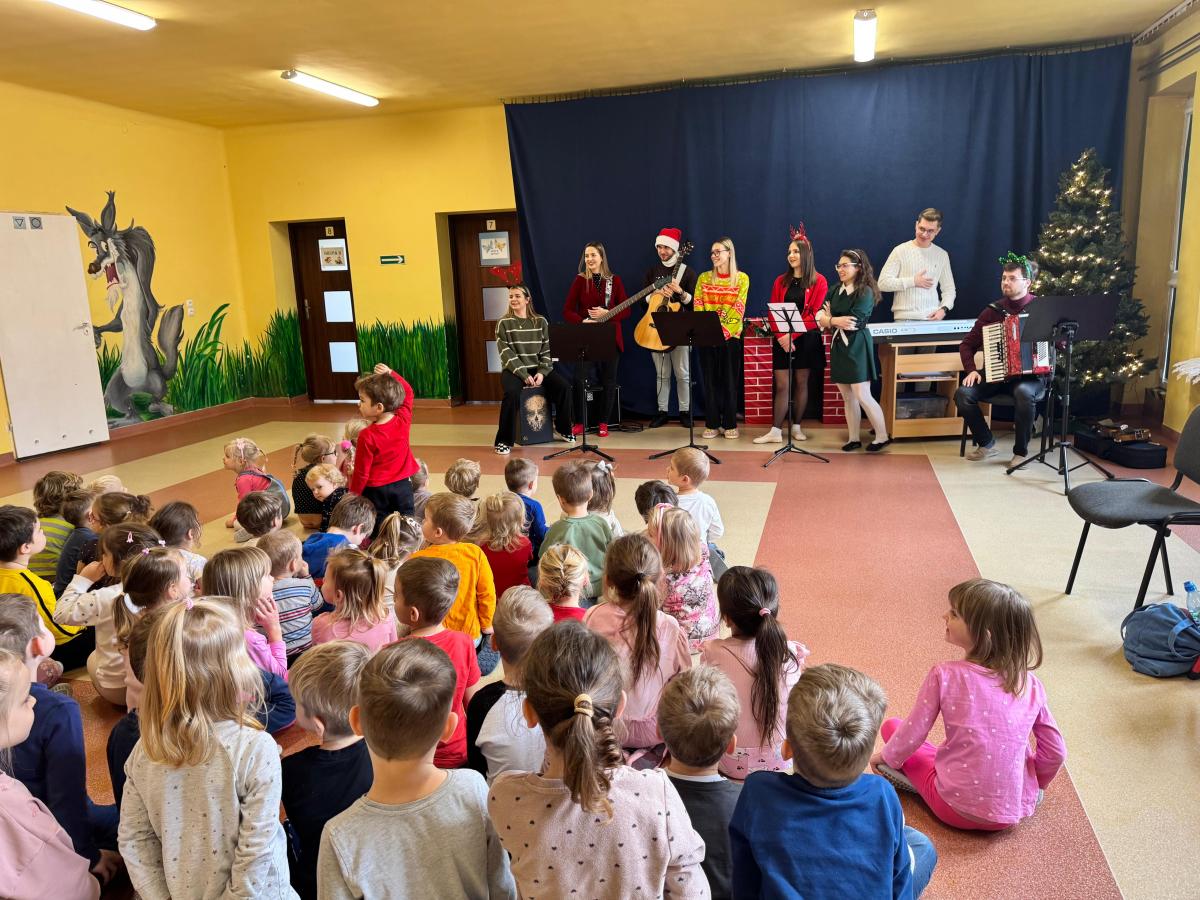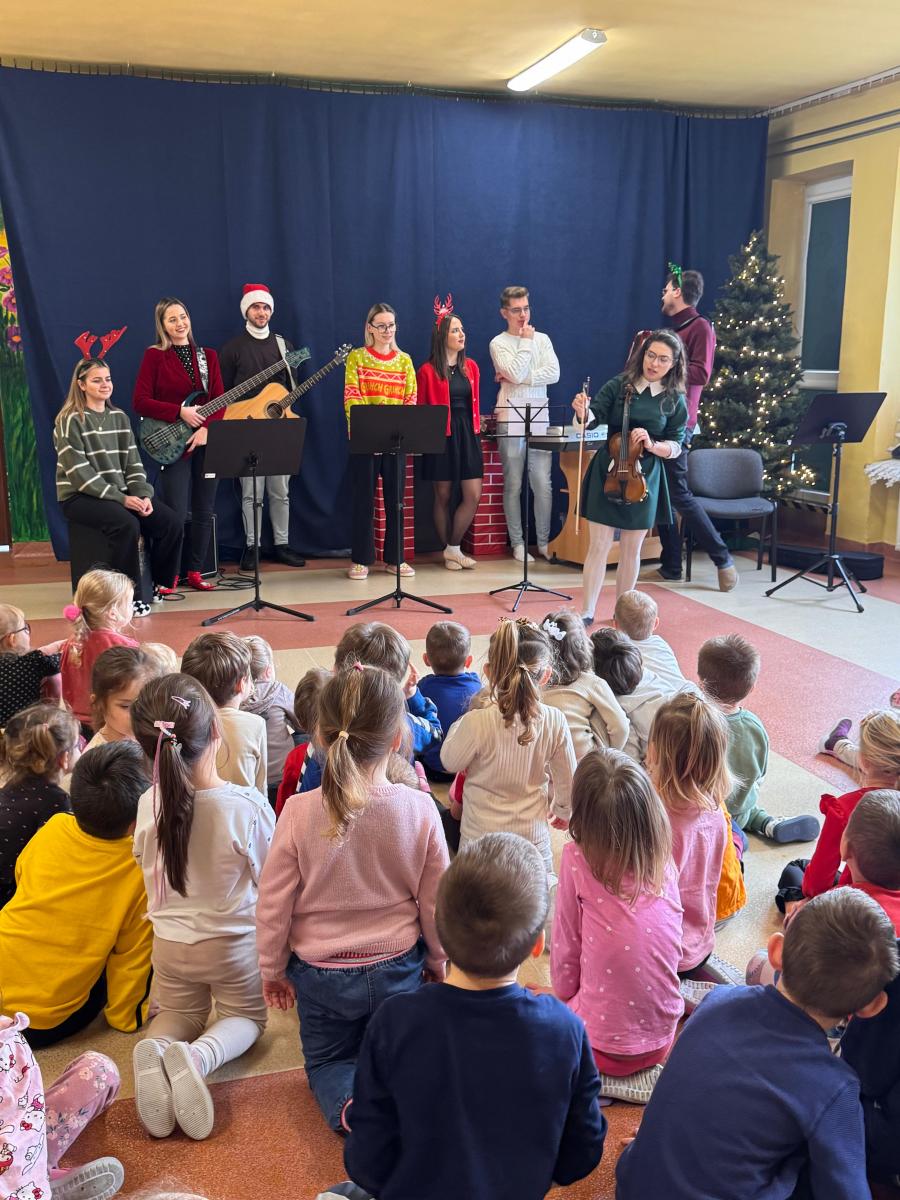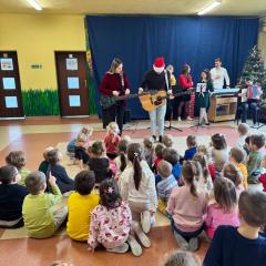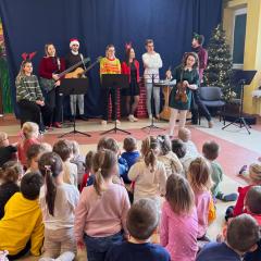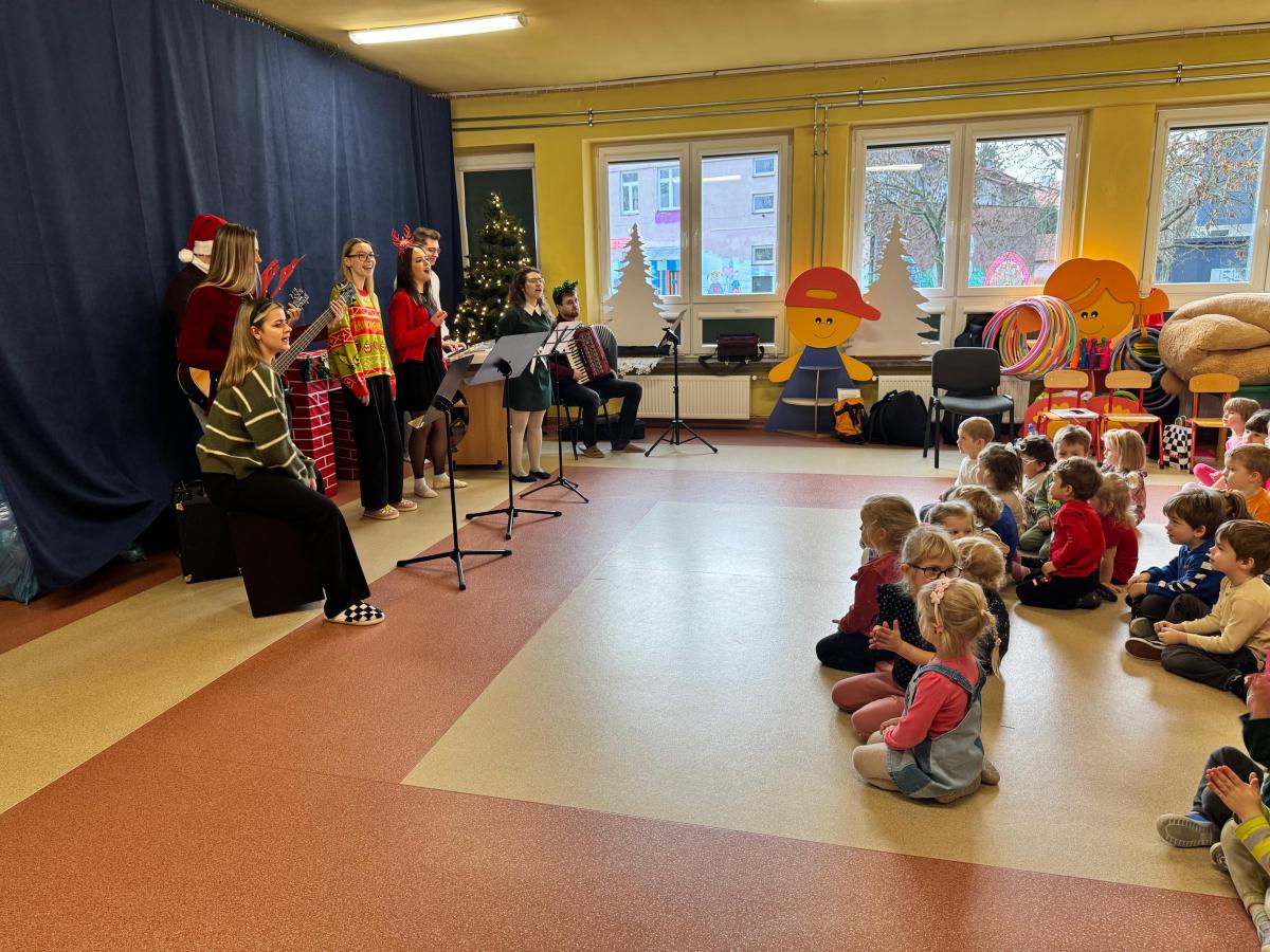 Dnia 3 grudnia w naszym przedszkolu odbył się występ praktykantów ze szkoły muzycznej. Zaśpiewali dla dzieci kilka kolęd, a następnie zaprezentowali różne instrumenty muzyczne. Opowiadali i pokazywali, jakie dźwięki wydają poszczególne instrumenty — czy są ciche, czy głośne, wysokie lub niskie. Dzieci z zainteresowaniem oglądały występ i aktywnie uczestniczyły w zajęciach muzycznych.