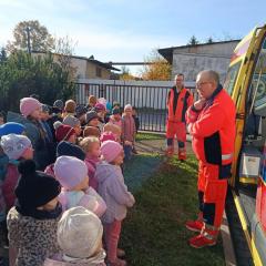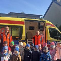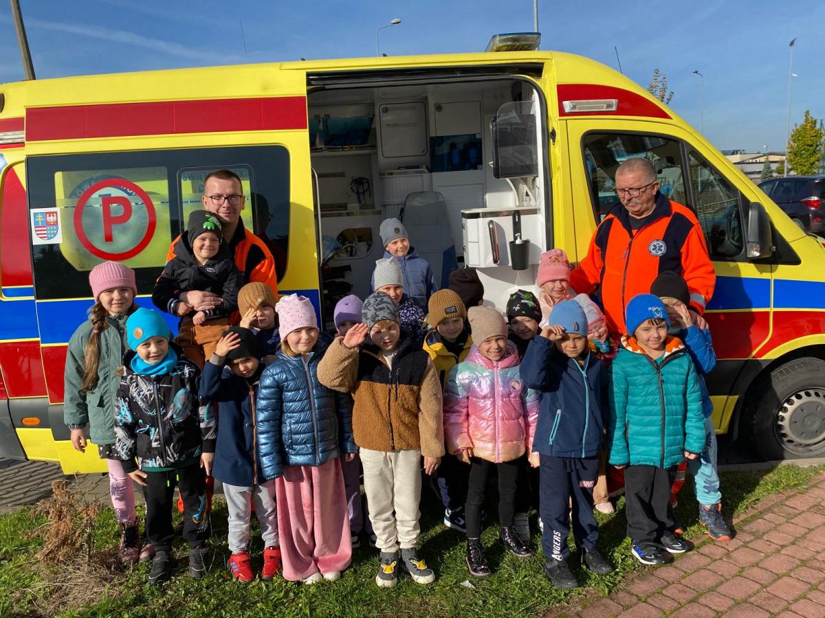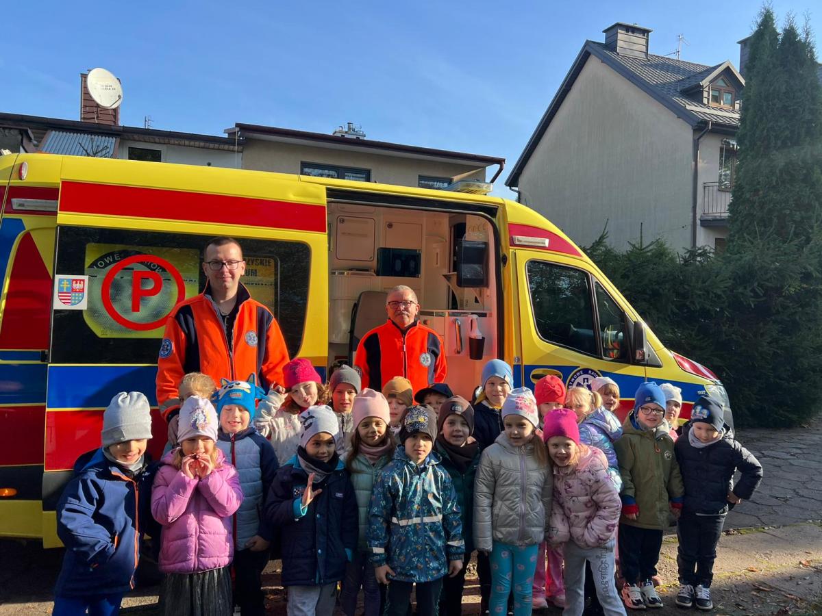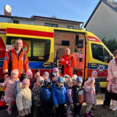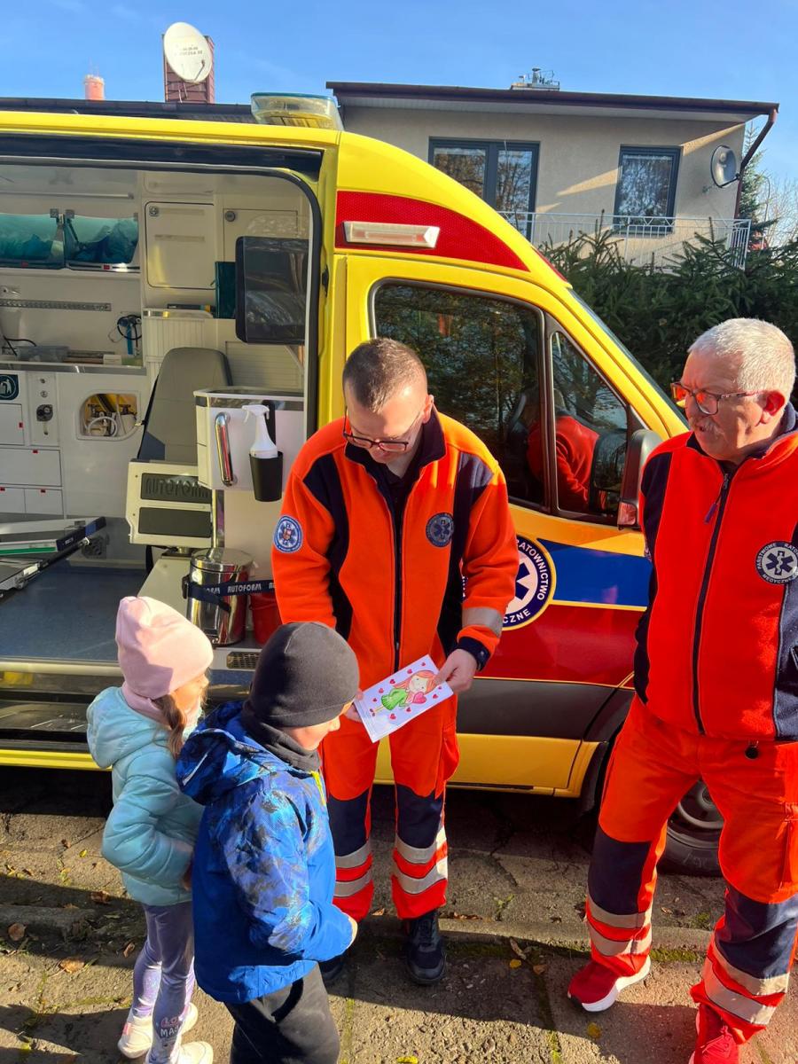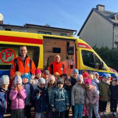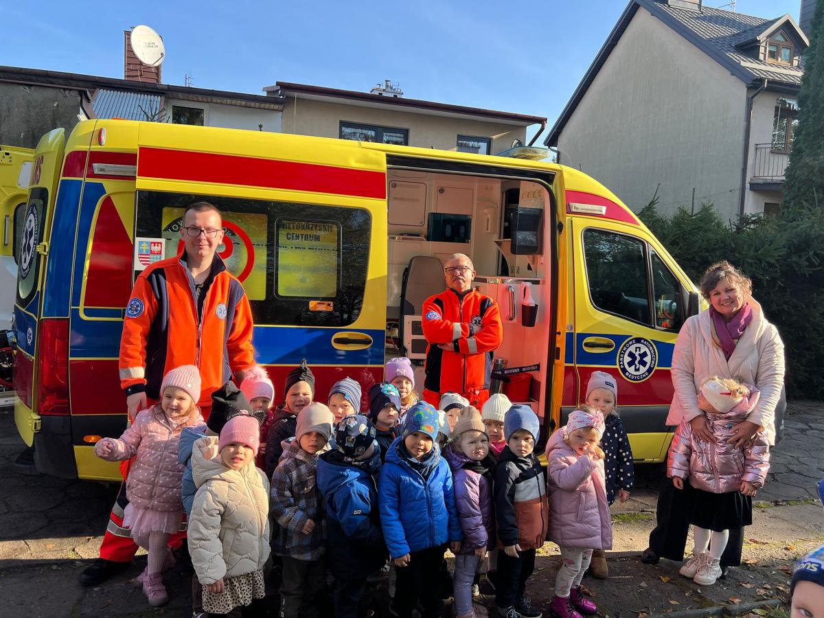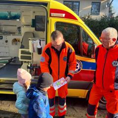 Dzisiejsza wizyta karetki pogotowia wzbudziła ogromne zainteresowanie i radość wśród dzieci. Celem akcji edukacyjnej było przybliżenie przedszkolakom pracy ratowników medycznych oraz oswojenie ich z pojazdem ratunkowym. Ratownicy w przystępny sposób opowiedzieli o swojej pracy, pokazali sprzęt ratujący życie, a nawet pozwolili dzieciom zajrzeć do wnętrza karetki, a także obejrzeć z bliska nosze i apteczki. Dzieci zadawały mnóstwo pytań, a wizyta przebiegła w bardzo przyjaznej atmosferze. Jej efektem była nie tylko wspaniała zabawa, ale i ważna lekcja o bezpieczeństwie i udzielaniu pierwszej pomocy. Dziękujemy ratownikom za poświęcony czas i cenną wiedzę!