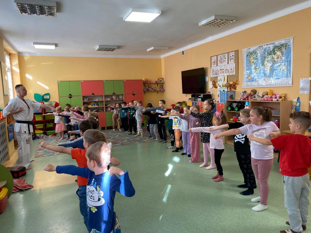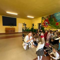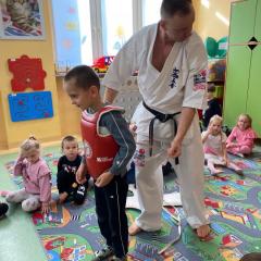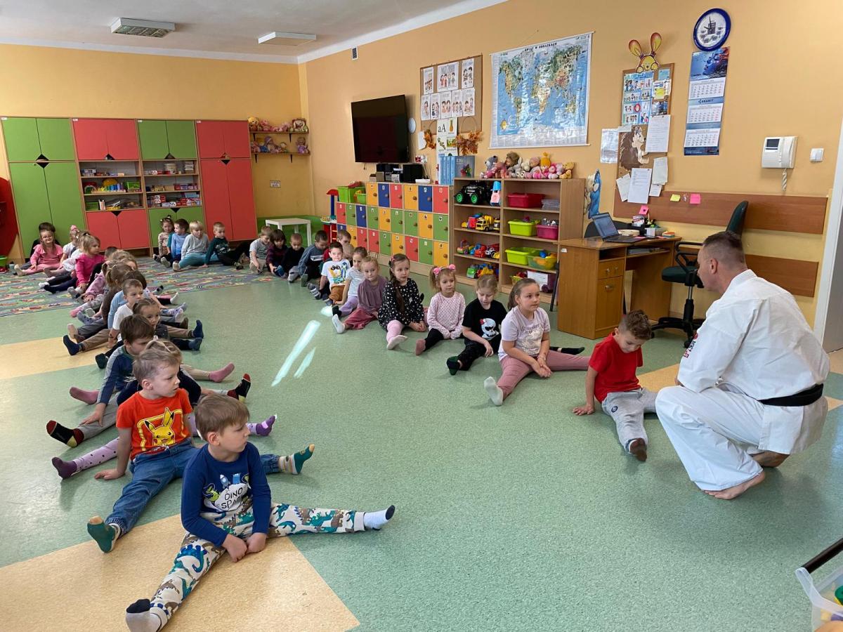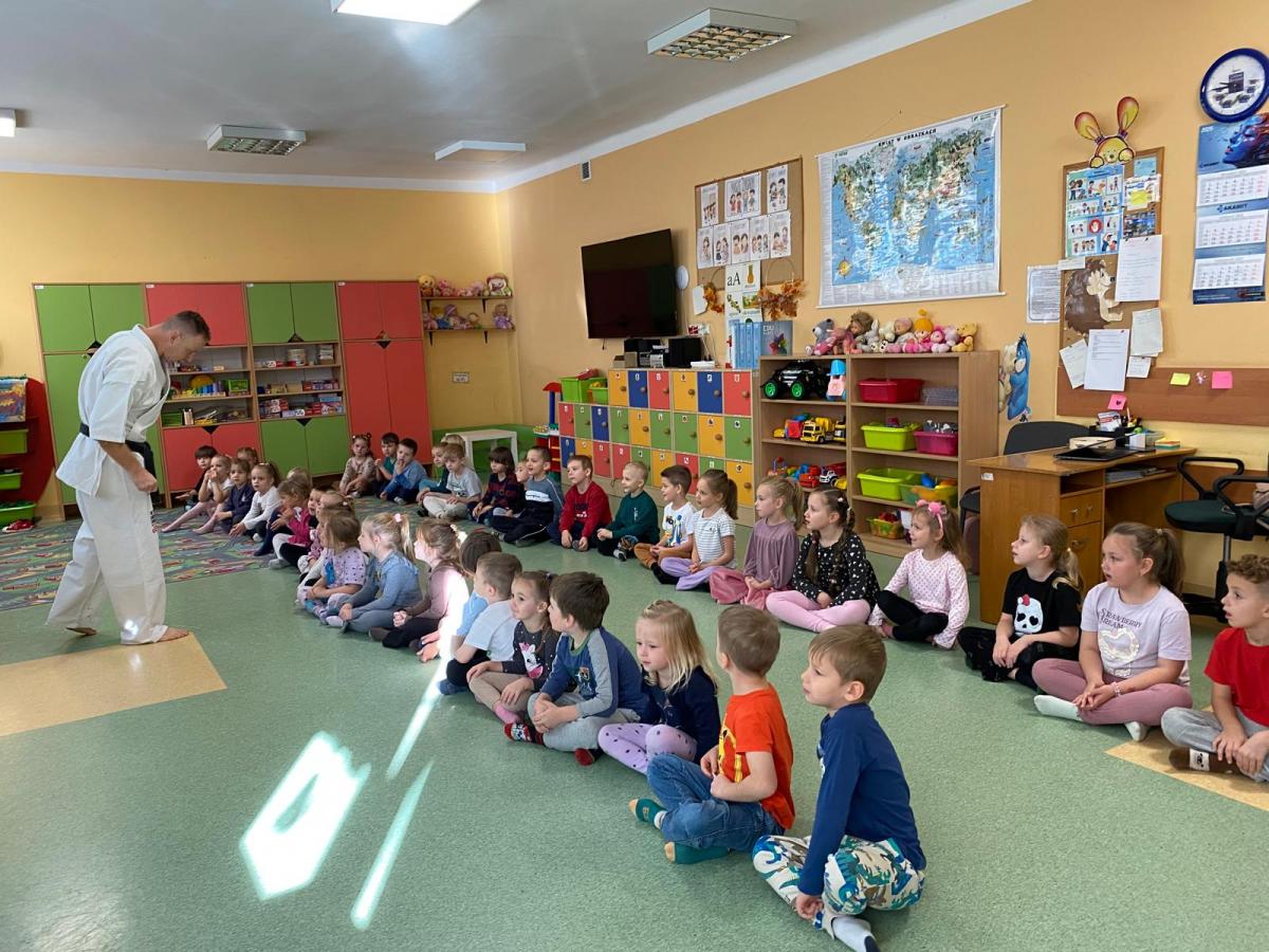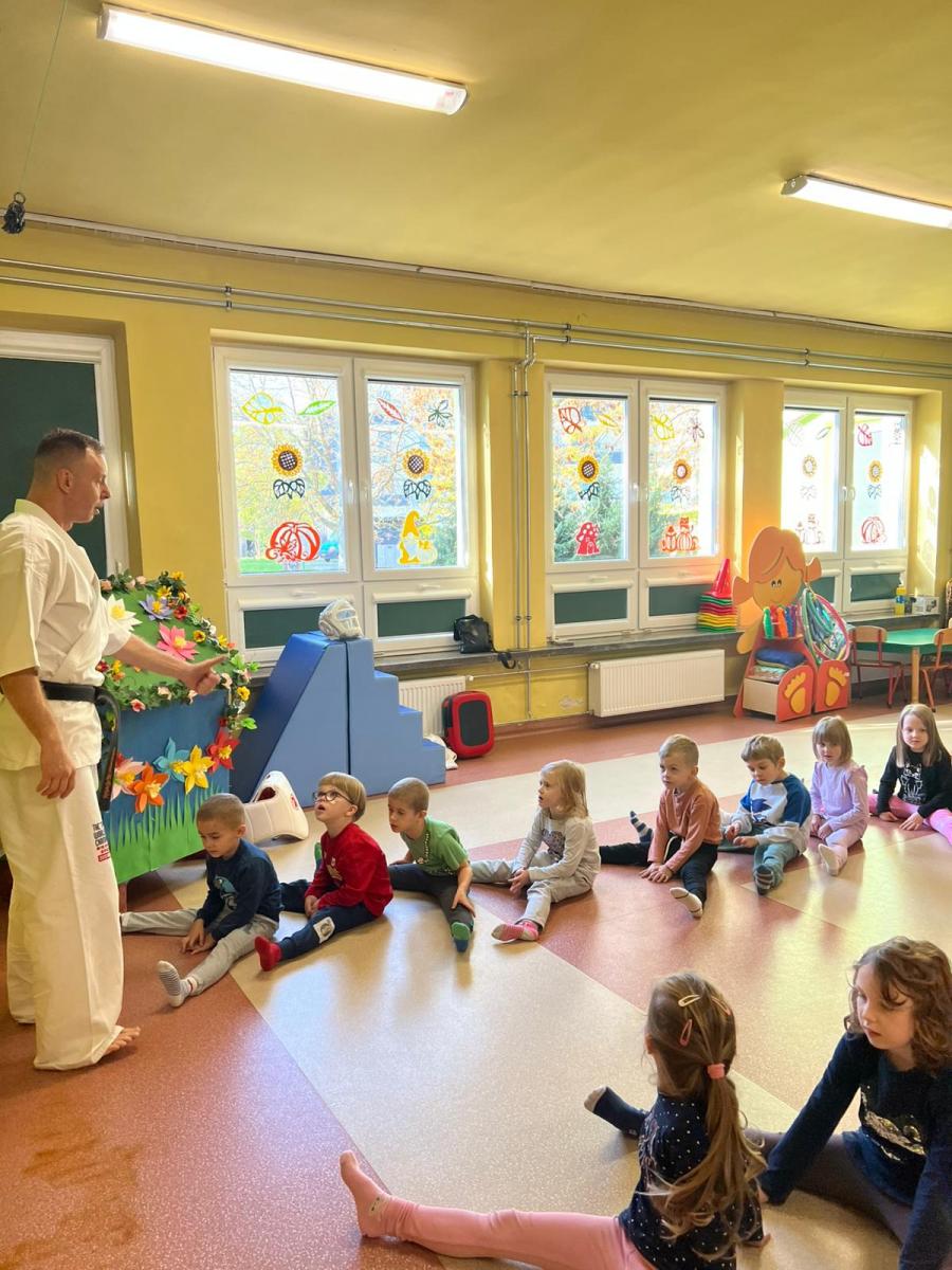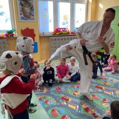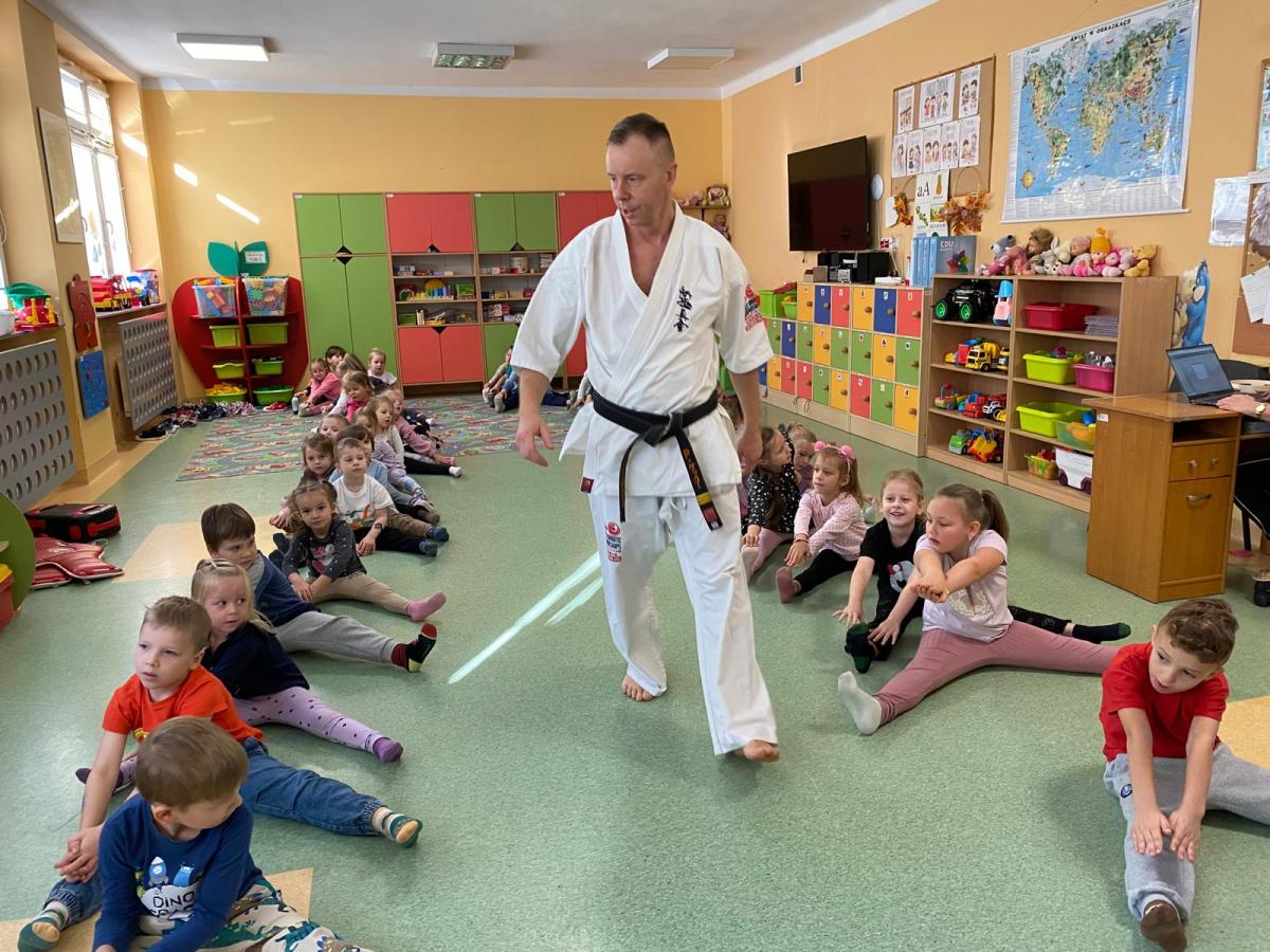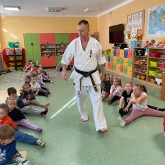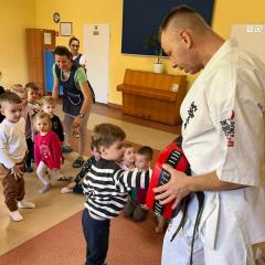 Spotkanie z panem Piotrem Kęćko, który trenuje karate miało na celu promowanie aktywności fizycznej, dyscypliny i szacunku już od najmłodszych lat. Trener (Sensei) wyjaśniał czym jest karate, pokazał strój (kimono) oraz przeprowadził mini-trening z rozgrzewką i prostymi technikami karate. Dzieci miały okazję spróbować różnorodnych ćwiczeń i dowiedziały się, że karate służy głównie do obrony. Spotkanie było dla przedszkolaków ciekawe, aktywne i pełne pozytywnych wrażeń.