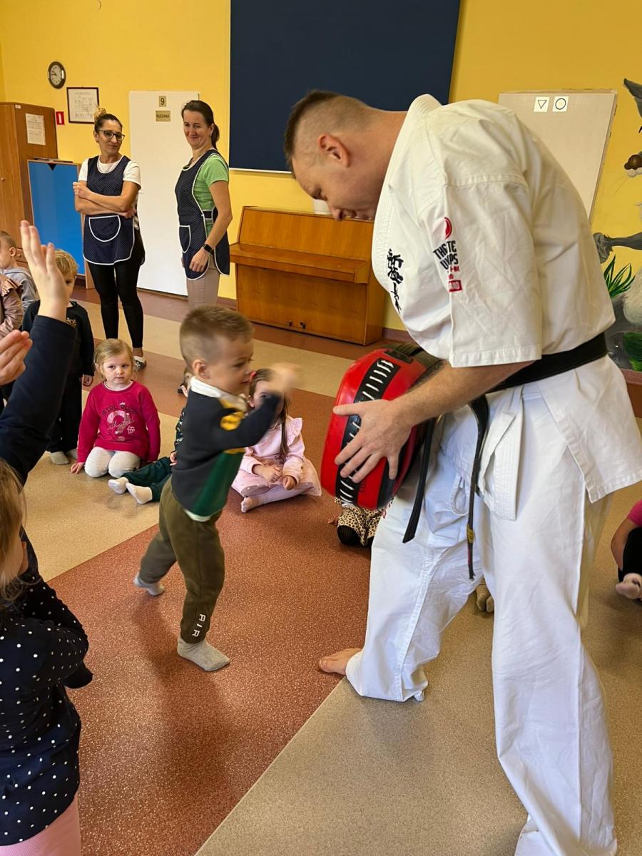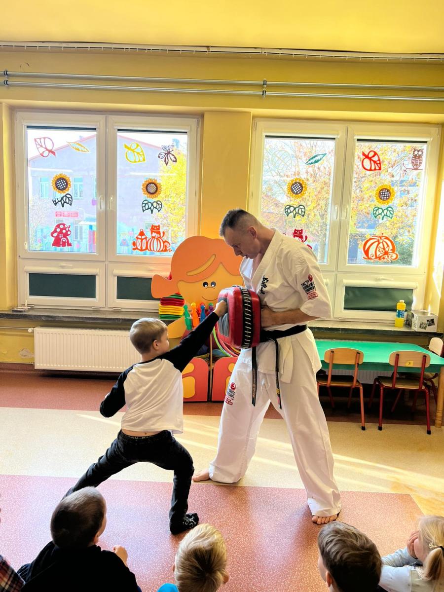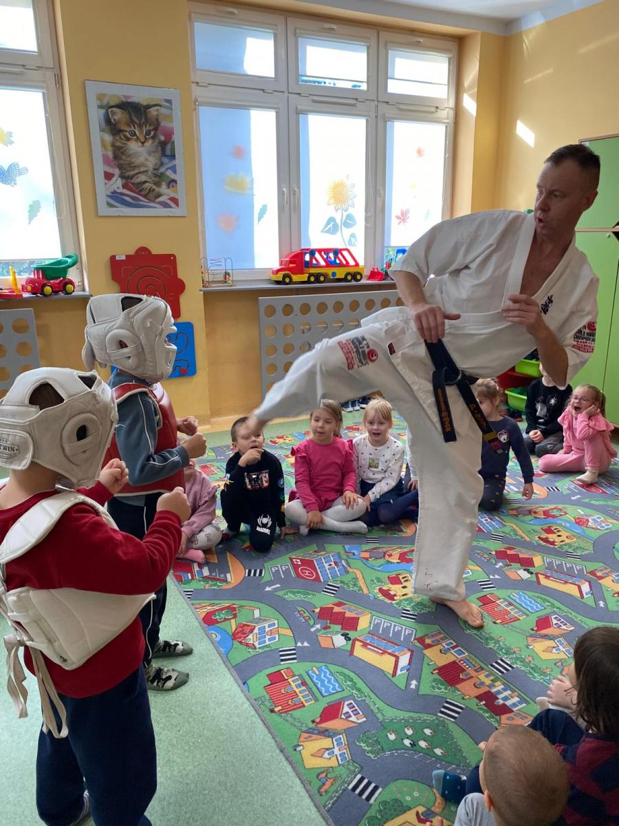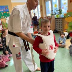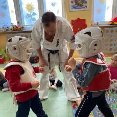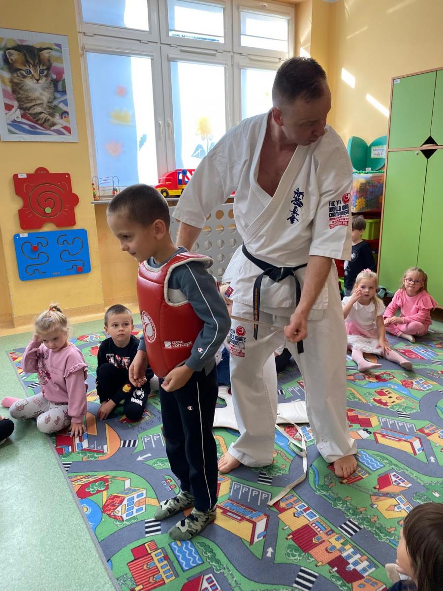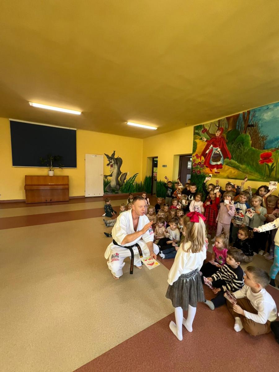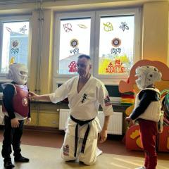 Spotkanie z panem Piotrem Kęćko, który trenuje karate miało na celu promowanie aktywności fizycznej, dyscypliny i szacunku już od najmłodszych lat. Trener (Sensei) wyjaśniał czym jest karate, pokazał strój (kimono) oraz przeprowadził mini-trening z rozgrzewką i prostymi technikami karate. Dzieci miały okazję spróbować różnorodnych ćwiczeń i dowiedziały się, że karate służy głównie do obrony. Spotkanie było dla przedszkolaków ciekawe, aktywne i pełne pozytywnych wrażeń.