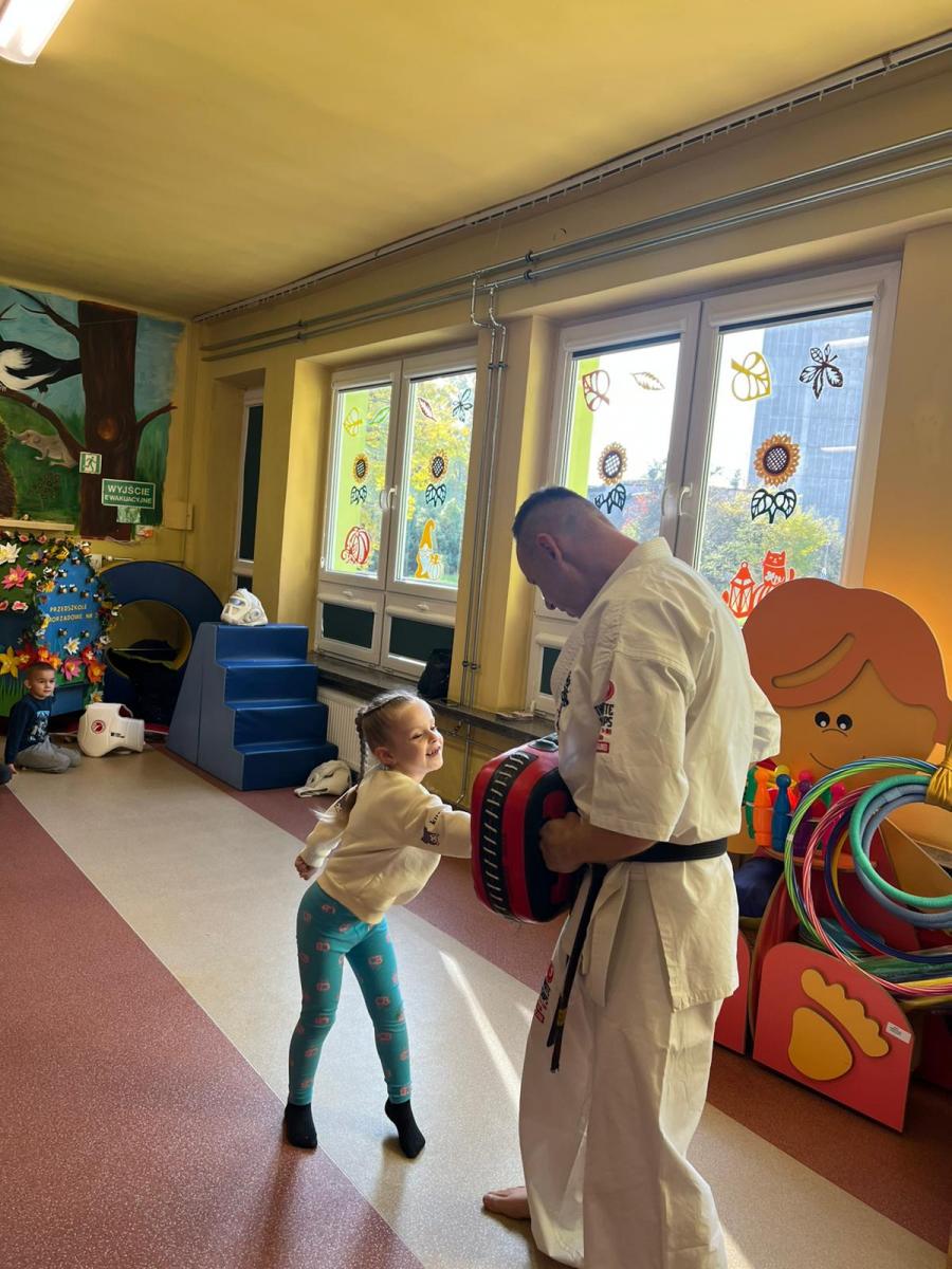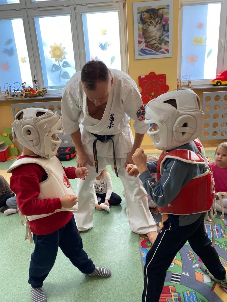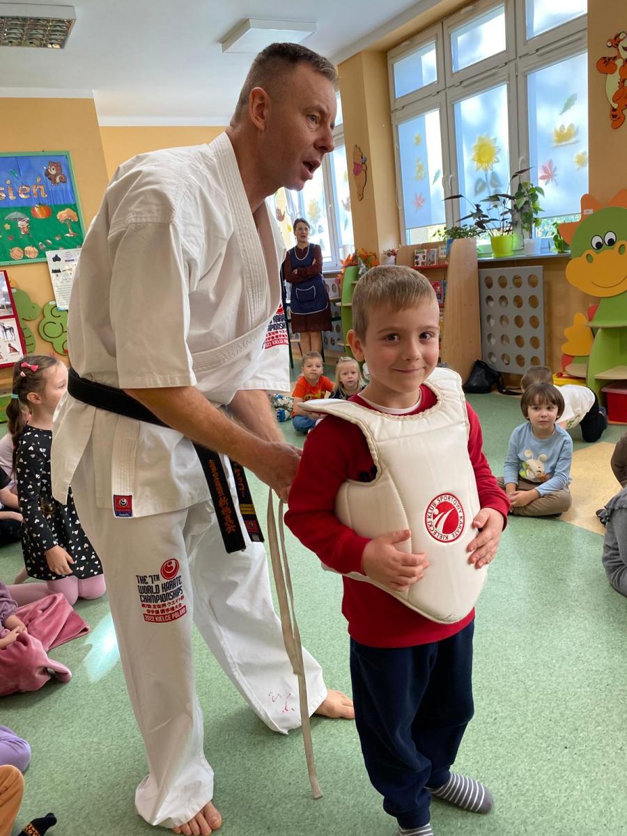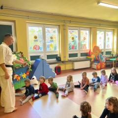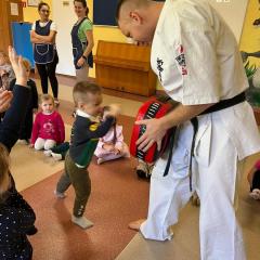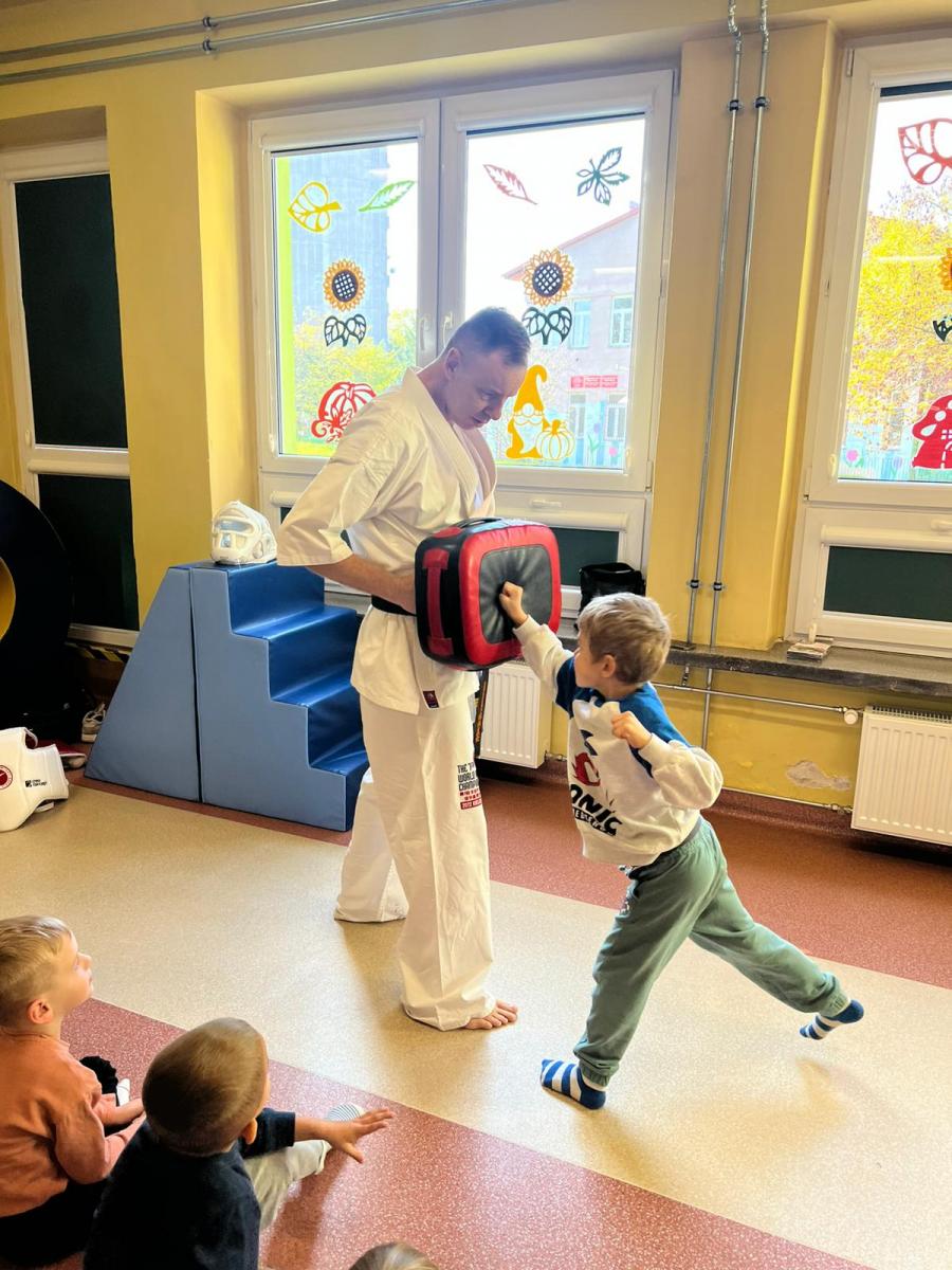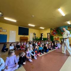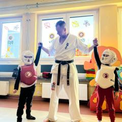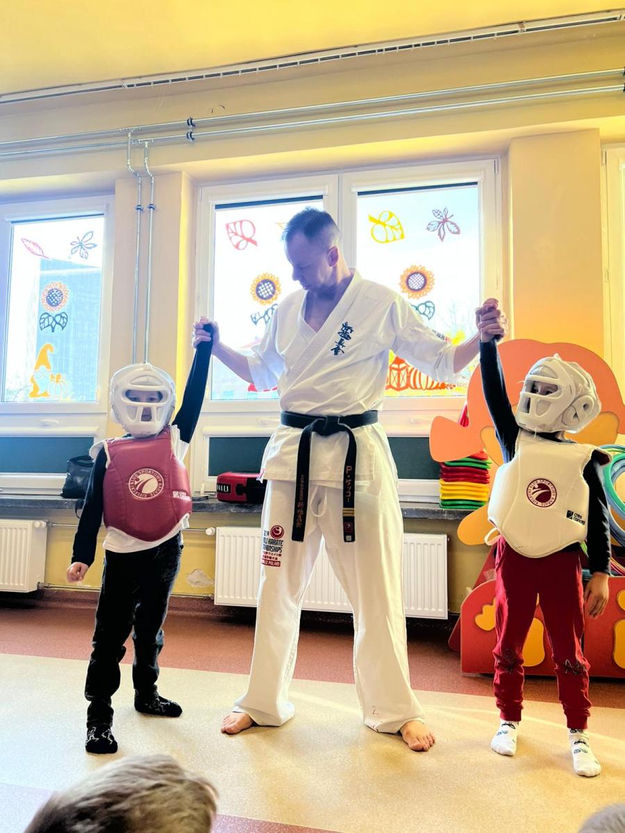 Spotkanie z panem Piotrem Kęćko, który trenuje karate miało na celu promowanie aktywności fizycznej, dyscypliny i szacunku już od najmłodszych lat. Trener (Sensei) wyjaśniał czym jest karate, pokazał strój (kimono) oraz przeprowadził mini-trening z rozgrzewką i prostymi technikami karate. Dzieci miały okazję spróbować różnorodnych ćwiczeń i dowiedziały się, że karate służy głównie do obrony. Spotkanie było dla przedszkolaków ciekawe, aktywne i pełne pozytywnych wrażeń.