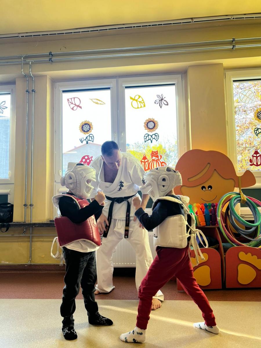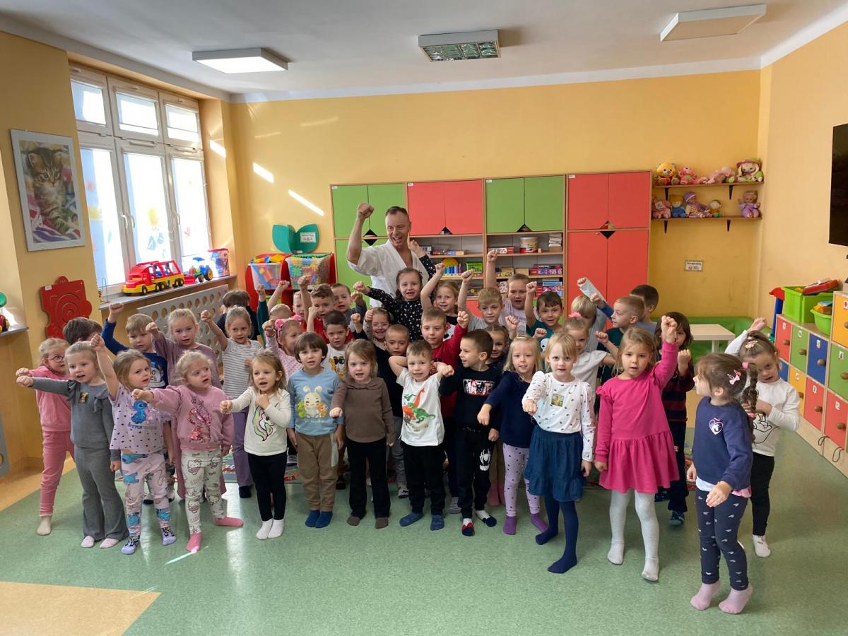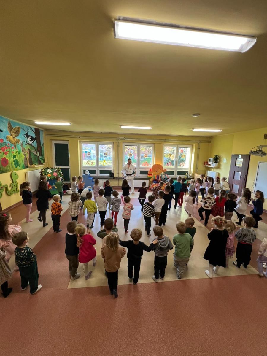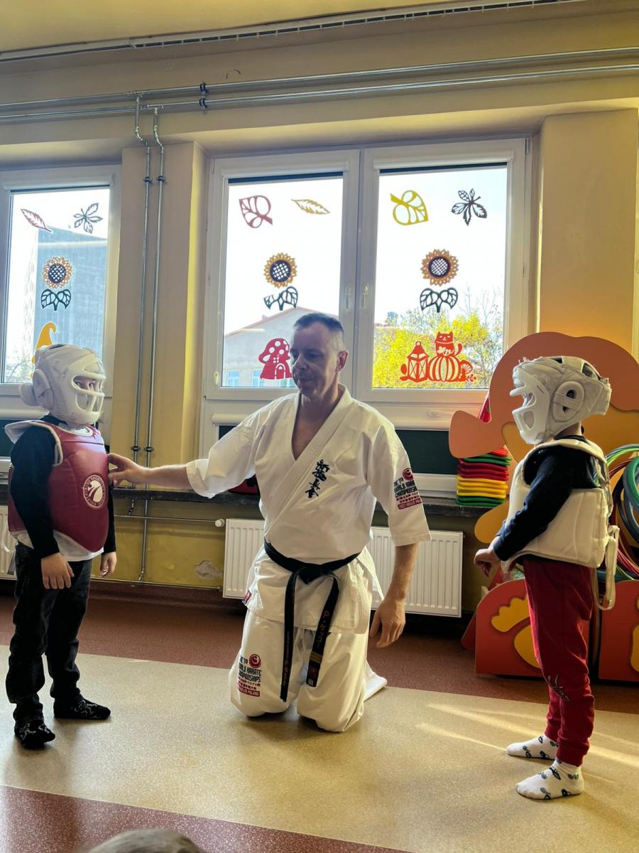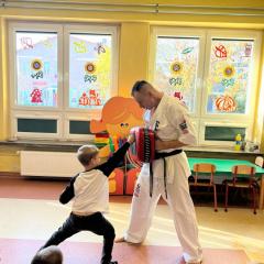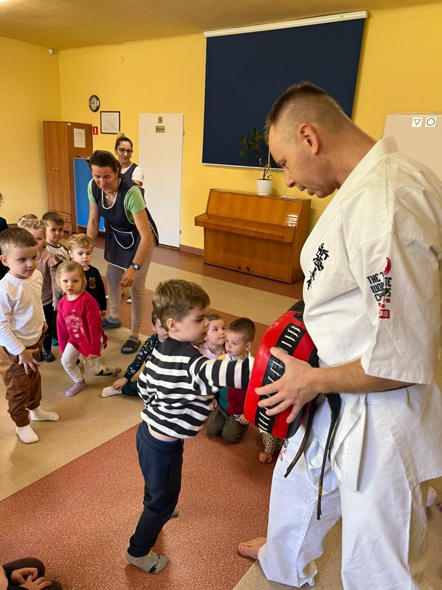 Spotkanie z panem Piotrem Kęćko, który trenuje karate miało na celu promowanie aktywności fizycznej, dyscypliny i szacunku już od najmłodszych lat. Trener (Sensei) wyjaśniał czym jest karate, pokazał strój (kimono) oraz przeprowadził mini-trening z rozgrzewką i prostymi technikami karate. Dzieci miały okazję spróbować różnorodnych ćwiczeń i dowiedziały się, że karate służy głównie do obrony. Spotkanie było dla przedszkolaków ciekawe, aktywne i pełne pozytywnych wrażeń.