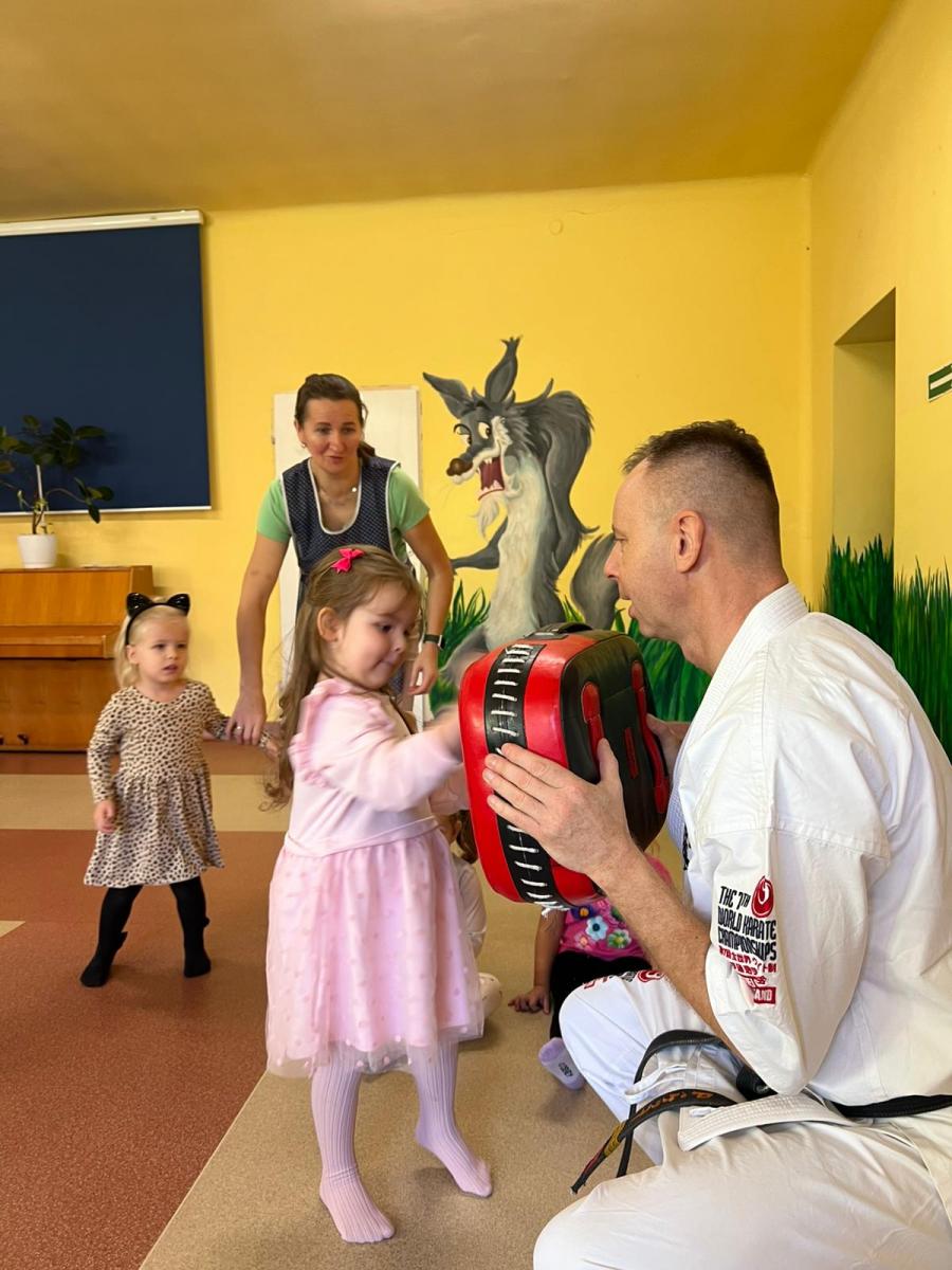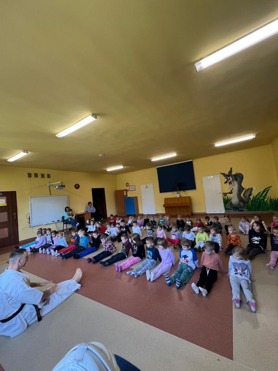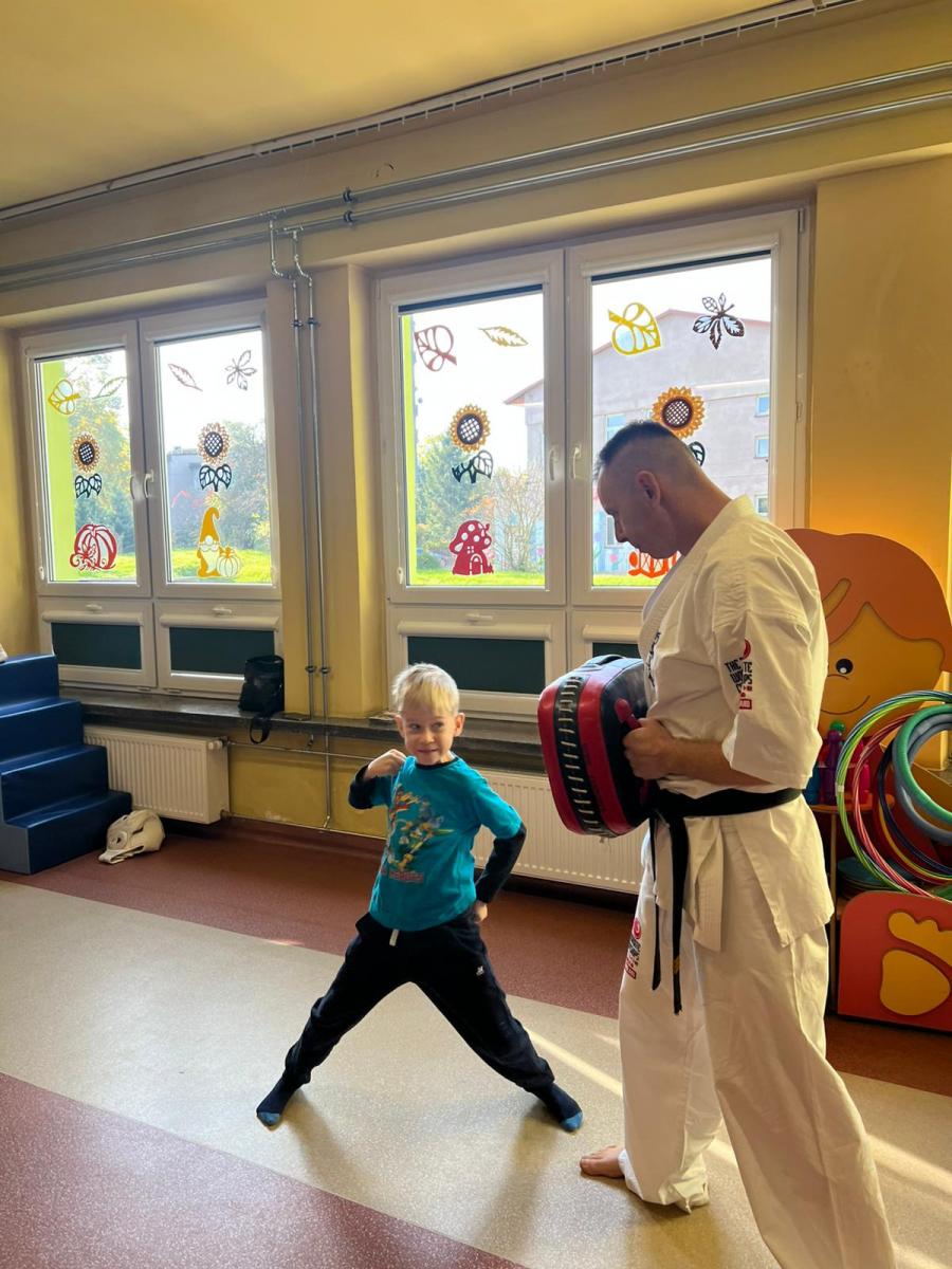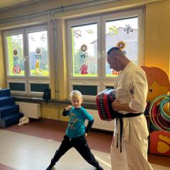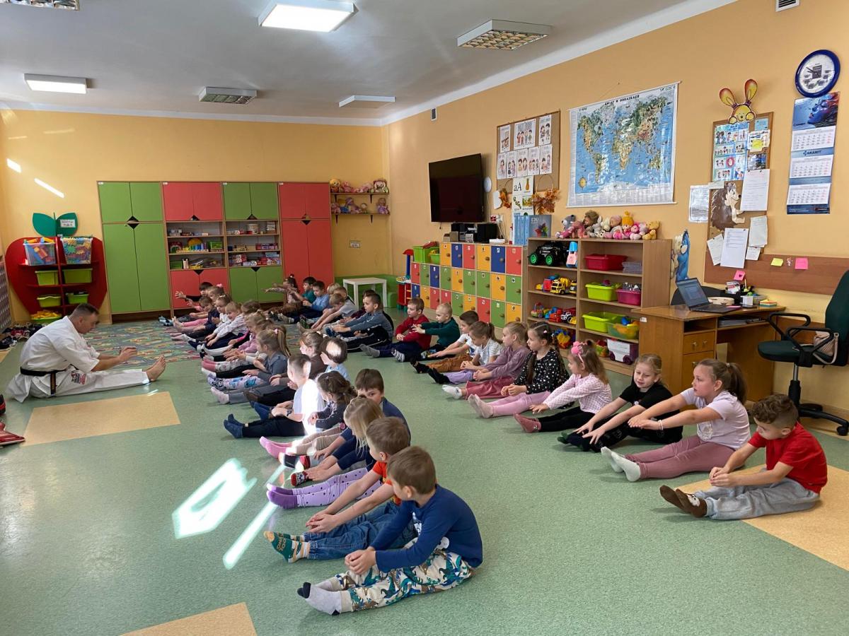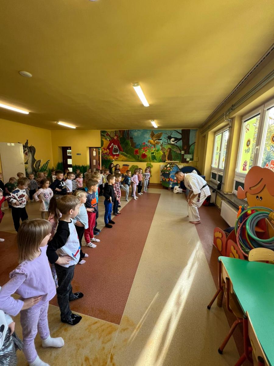 Spotkanie z panem Piotrem Kęćko, który trenuje karate miało na celu promowanie aktywności fizycznej, dyscypliny i szacunku już od najmłodszych lat. Trener (Sensei) wyjaśniał czym jest karate, pokazał strój (kimono) oraz przeprowadził mini-trening z rozgrzewką i prostymi technikami karate. Dzieci miały okazję spróbować różnorodnych ćwiczeń i dowiedziały się, że karate służy głównie do obrony. Spotkanie było dla przedszkolaków ciekawe, aktywne i pełne pozytywnych wrażeń.