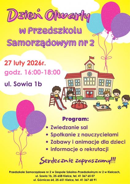 Serdecznie zapraszamy Rodziców wraz dziećmi na Dzień Otwarty, który odbędzie się 27 lutego 2026 roku (piątek) w godzinach 16:00-18:00 w budynku naszego przedszkola przy ulicy Sowiej 1b.