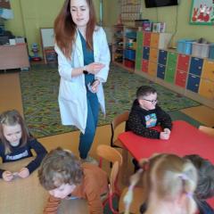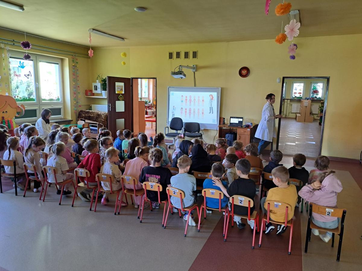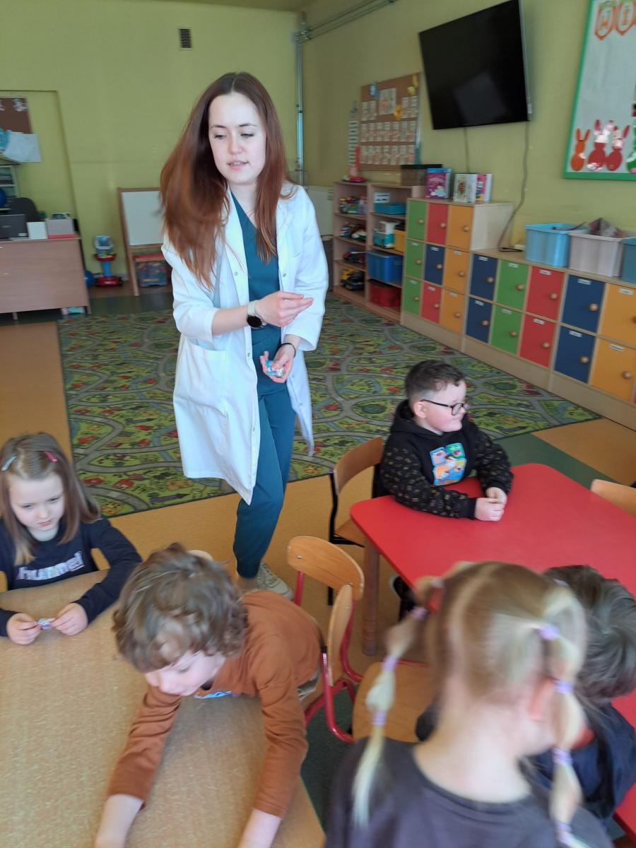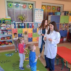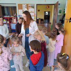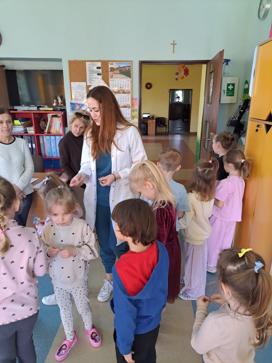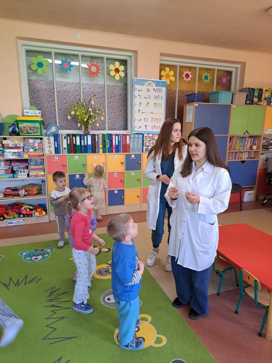 Dzisiaj obchodziliśmy w przedszkolu Światowy Dzień Zdrowia, dlatego z tej okazji zaprosiliśmy do nas studentki kierunku lekarskiego Uniwersytetu Jana Kochanowskiego w Kielcach. Panie przeprowadziły dla wszystkich zajęcia edukacyjne na temat zdrowia oraz pokazały wychowankom jak używać ciśnieniomierza, szpatułki czy stetoskopu. Dzieci miały również okazję zobaczyć szkielet ludzkiego ciała do nauki poszczególnych kości. Celem zajęć była promocja zdrowego stylu życia, zachęcanie do badań oraz zapoznanie dzieci z zawodem lekarza.